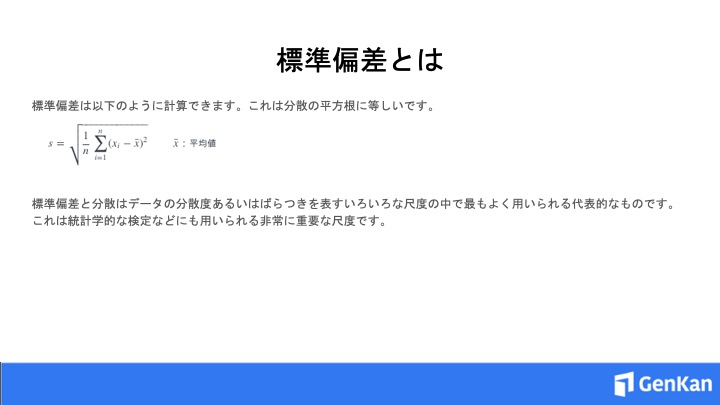 標準偏差は分散の平方根で求めることができます。分散はデータのばらつきを表し各データとそのデータの平均の差の二乗和をデータ数で割ることで求めることができます。分散だと式の性質上、単位が二乗されたものが算出されます。そこで平方根をとって標準偏差を求めることで元のデータと同じ単位が扱えます。